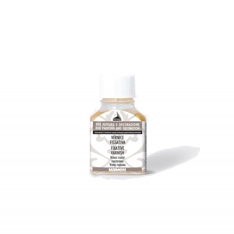La vernice fissativa universale Maimeri è composta da resina acrilica e regia minerale. Le caratteristiche di questa vernice sono: Soluzione limpida e cristallina, trasparente, incolore, non ingiallisce, fissa e protegge il dipinto o qualsiasi altro oggetto. Uso universale, aumenta moderatamente la brillantezza dei colori se stesa in strato sottile, conferisce brillantezza se applicata a più strati.